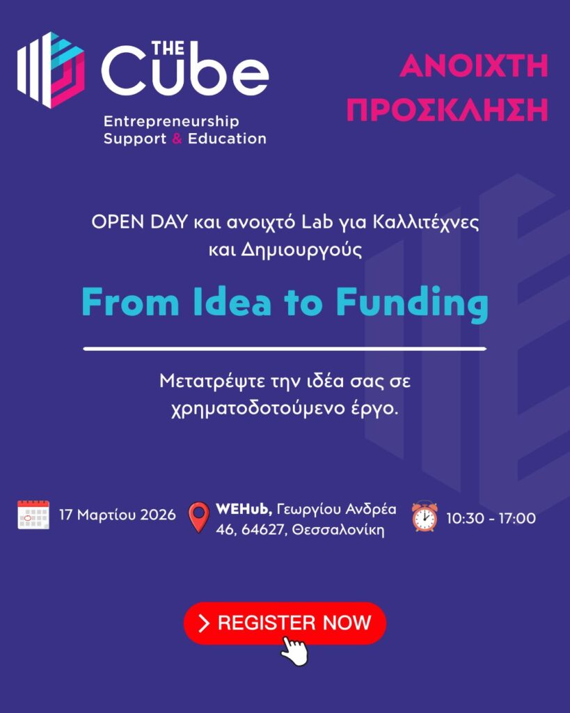 Στις 17 Μαρτίου 2026, η CUBE σας προσκαλεί στο WEHub (Γεωργίου Ανδρέα 46, 54627, Θεσσαλονίκη) σε μια ανοιχτή, διαδραστική ημέρα αφιερωμένη στη χρηματοδότηση, τη διεθνή κινητικότητα και την ανάπτυξη καλλιτεχνικών projects.